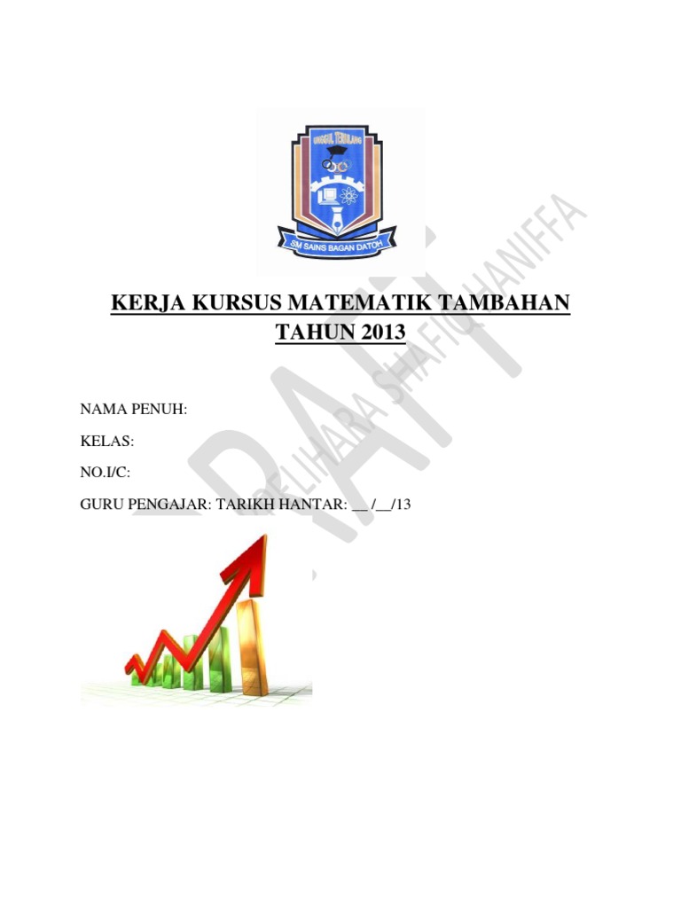 ADDITIONAL Mathematics project work 1 2012 aims to improve thinking skills promote effective mathematical communication and develop positive attitude towards mathematics. 1 PENDAHULUAN 2 OBJEKTIF 3 PENGENALAN 4 BAHAGIAN 1 12 BAHAGIAN 2 21 BAHAGIAN 3 26 PENEROKAAN LANJUTAN 28 REFLEKSI 33 KESIMPULAN. KERJA KURSUS MATEMATIK TAMBAHAN 2018 NAMA.